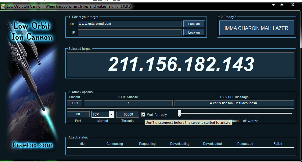 使用低轨道等离子炮(Loic)进行测试这里我对我们211.156.182.143进行Tcp DDOS攻击
