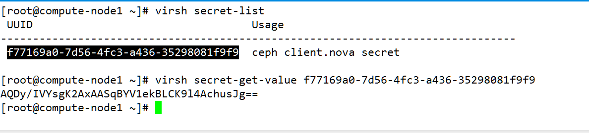 virsh secret-set-value –secret f77169a0-7d56-4fc3-a436-35298081f9f9 –base64 $(cat client.nova.key )
