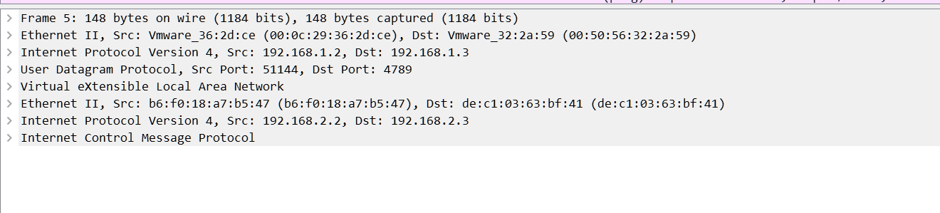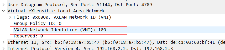 有两层报文封装第一层源ip为192.168.2.2 目标ip为192.168.2.3,然后被udp封装,走vxlan隧道,第二层源ip为192.168.1.2 目标ip为192.168.1.3