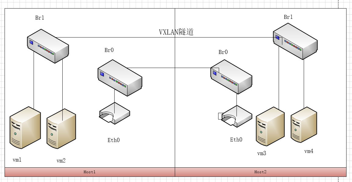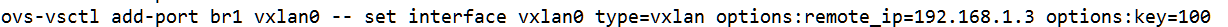 给br1上增加一个vxlan0接口类型为vxlan,远程ip为 host2上的br0 ip, vni为100