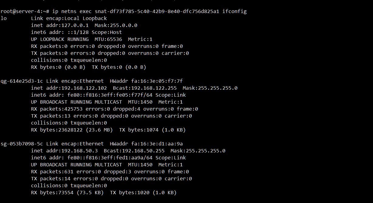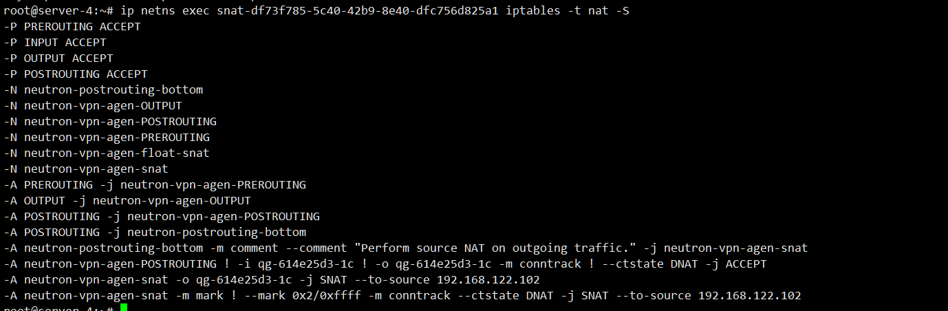 当该网络内其他主机需要上外网时,源ip会已postrouting形式,snat成路由器的网关,这步操作会在snat-xx命名空间内做