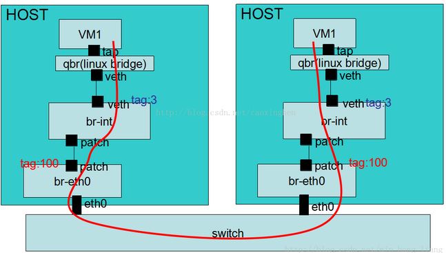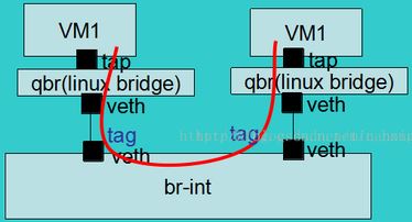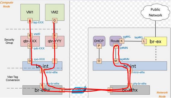 vm的流量首先经过tap网卡到qbr桥上,qbr桥是linux-bridge桥,曾经的ovs不支持安全组的实现所以openstack只能加一个qbr桥在上面通过iptables来实现安全组,(mitaka版本中已经没有了因为ovs已经可以通过openflow来实现了),通过veth口将br-int和qbr桥连接起来,流量到br-int上,br-int上有对应的ovs规则转发到br-eth0上,,r-eth0 中的 flow rules。从 patch port 进入的数据帧,将内部 ocal_id 修改为vlan_id,再从 eth0 端口发出。通过交换机到达另外一个计算机节点。