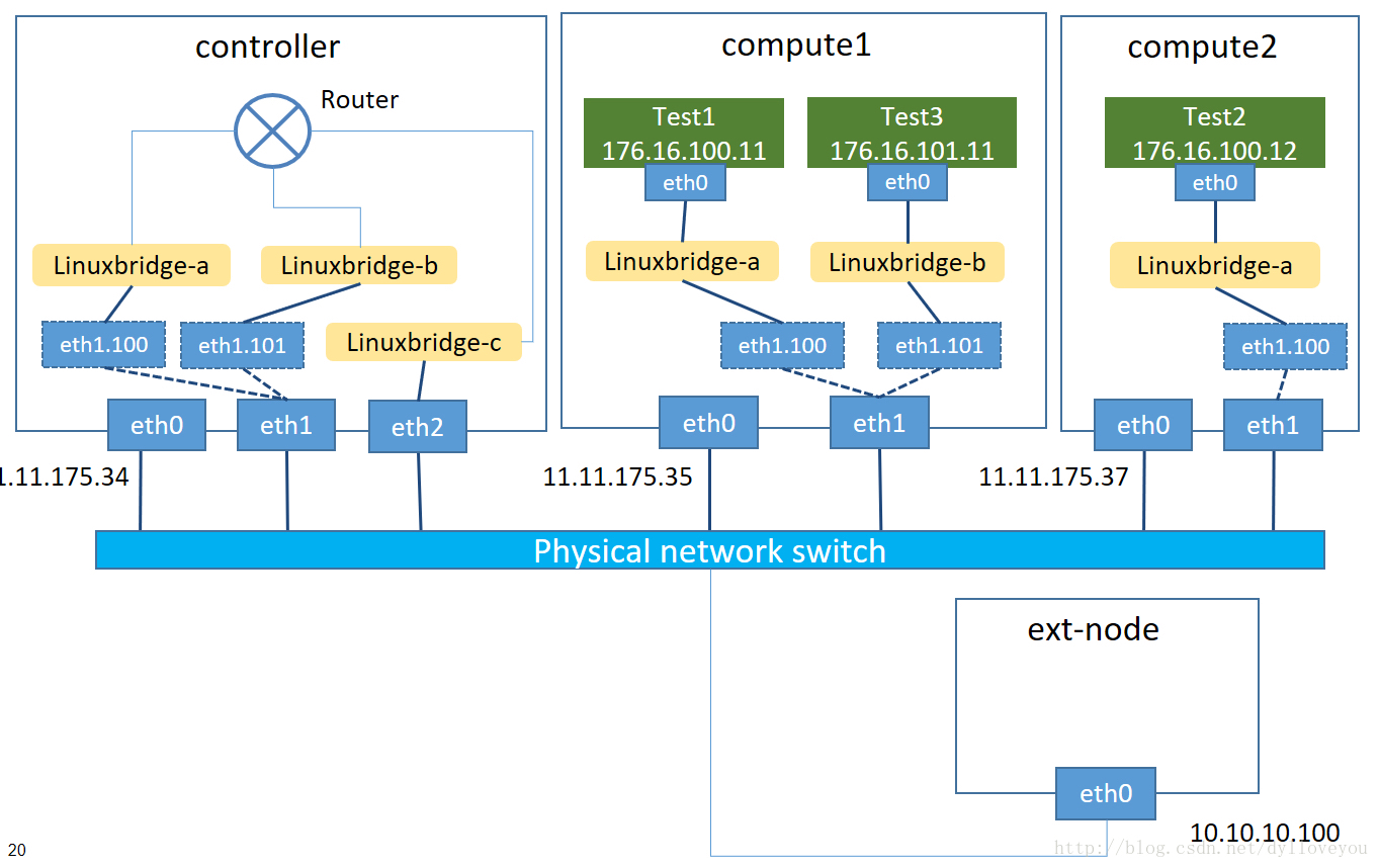 比如租户a的私有网络是vlan100,租户b的私户网络是vlan200,然后linuxbridge会将在这个计算节点上创建两个网桥。然后用vconfig将对应的网卡创建出子接口,挂到刚刚创的桥上,在将对应的虚机tap网卡挂载到对应的桥上。
