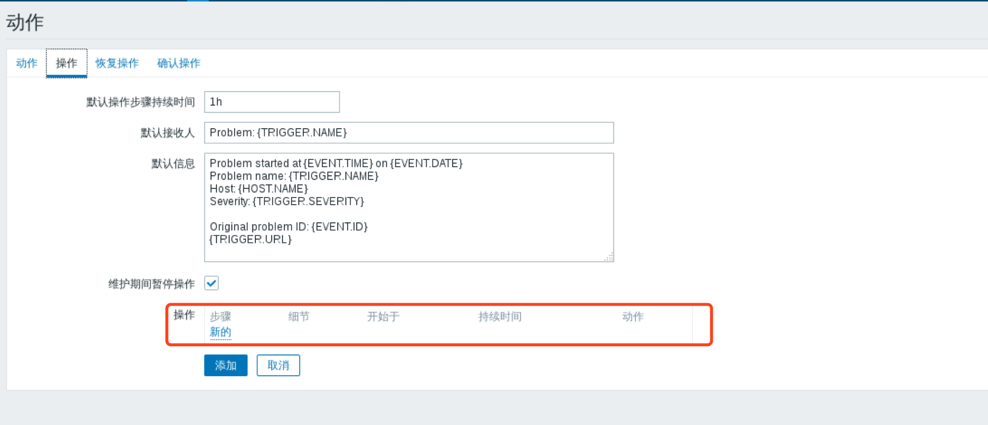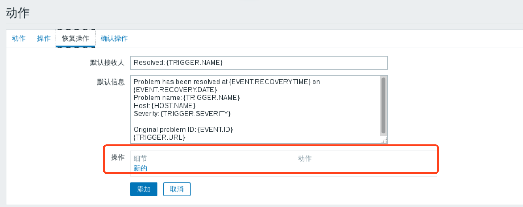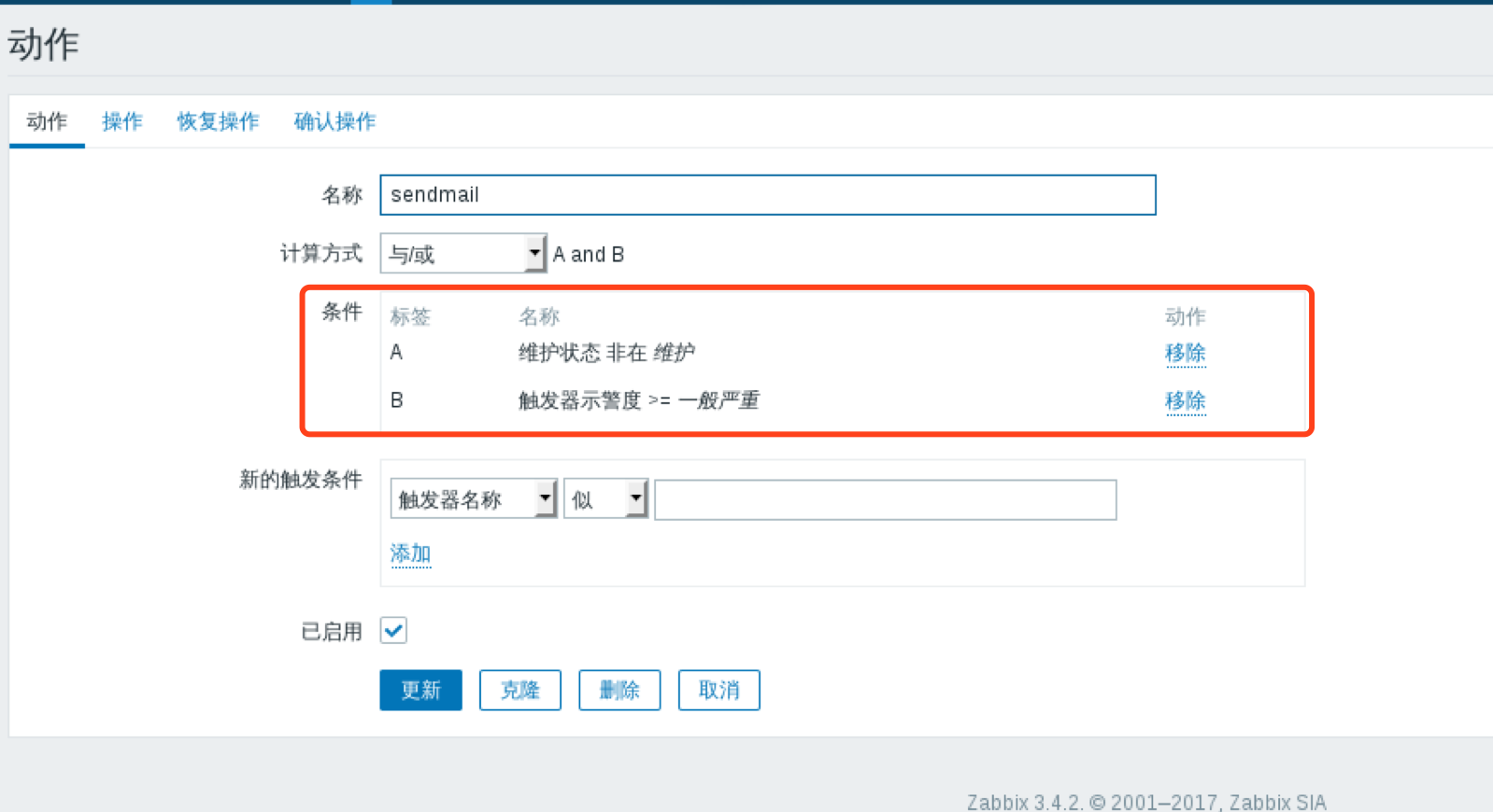 创建动作,zabbix在3.4.2版本中对创建动作这块有较大改动,多了确认操作,以前只有故障和恢复时发邮件,触发动作的条件可以自己配置。