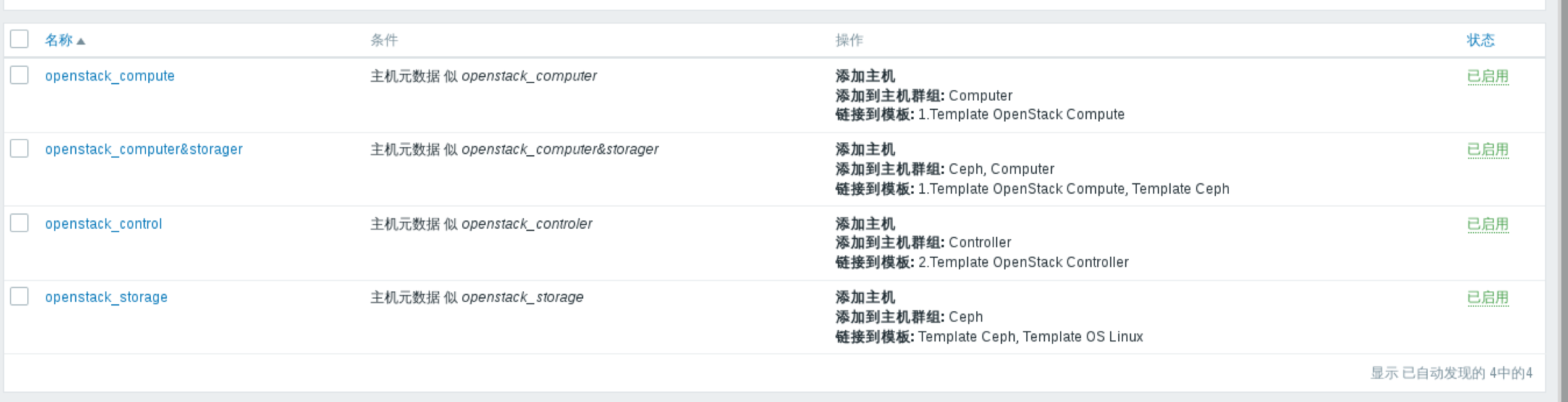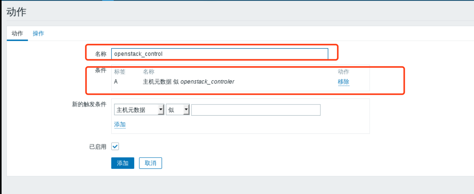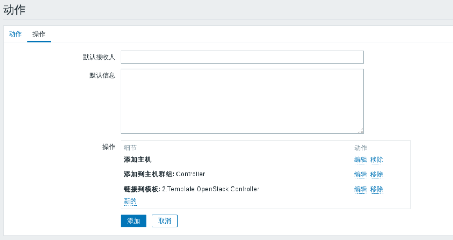 自动注册就是zabbix-server根据zabbix-agent里面配置的HostMetadata参数的值去进行一系列的操作,和自动发现不一样的是,自动发现只能跟据zabbix-server配置的扫描的网段去添加机器,非常不灵活,并且这个操作是zabbix-server发起的机器规模一大,对zabbix-server有很大的负载压力。自动注册是agent端主动将HostMetadata参数的值给server,server根据管理员的配置在做出相应的操作,在这里比如我openstack的控制节点我就在agent端的HostMetadata配置openstack_controler、然后计算节点配置openstack_computer、存储节点openstack_storager、计算和存储融合节点为 openstack_computer&storager,然后在zabbix-server端创建相应的动作如下图(以添加control为例)其他类似。