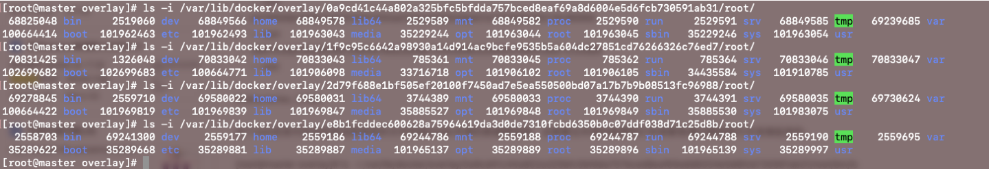 1 | [root@master overlay]# ls -i /var/lib/docker/overlay/0a9cd41c44a802a325bfc5bfdda757bced8eaf69a8d6004e5d6fcb730591ab31/root/bin/ls |