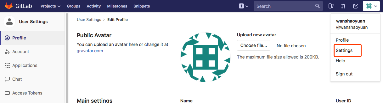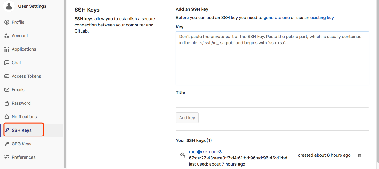 在gitlab的SSH keys处贴上机器的公钥,注意区分机器