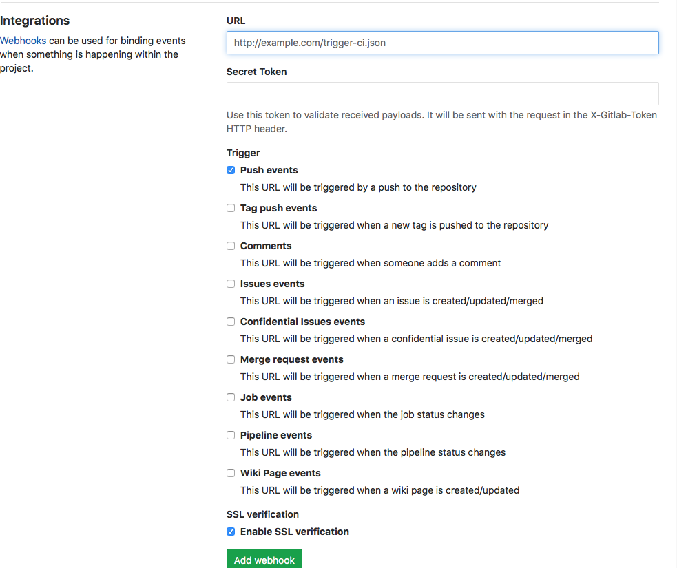 这里我们使用Build when a change is pushed to GitLab. GitLab CI Service URL的方式,因为使用定时检查的话对Jenkins压力会很大的,使用webhook的方式,当gitlab有push代码或其他方式时会通知Jenkins,所以这里还需要配置gitlab的webhook