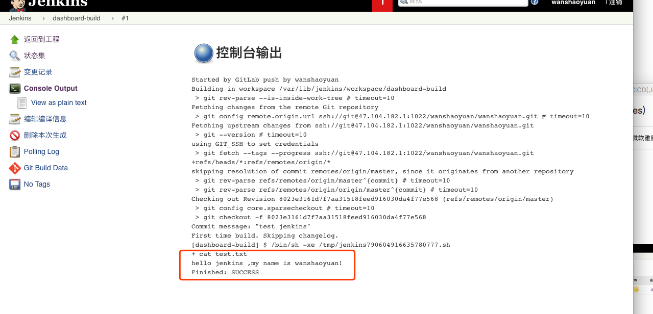 做个简单的操作比如说我git push一个test.txt的文件上去,然后用构建命令就去读取这个文件