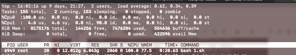 查看top看见两个逻辑核的空闲率都为0