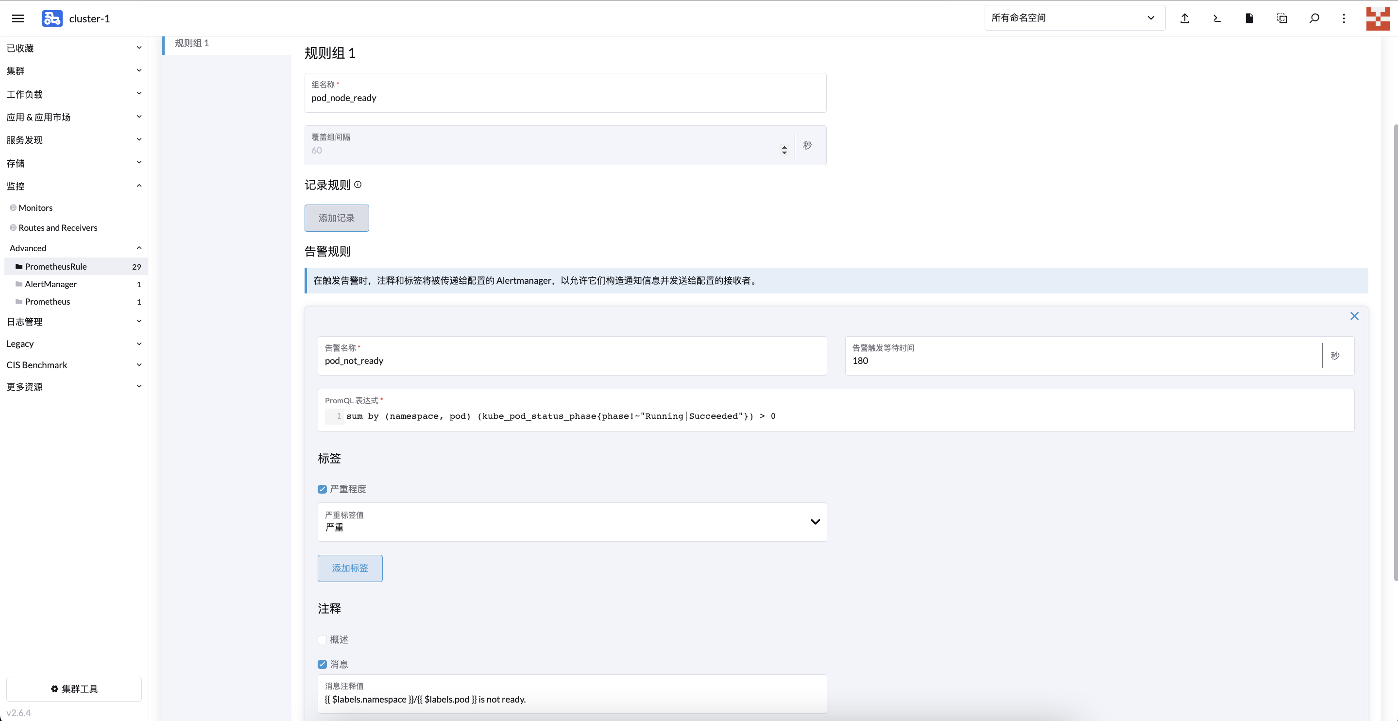 默认启用监控会会自动添加一些ServiceMonitor监控规则和Prometheus Rules 告警规则,主要是针对平台组件监控和集群内节点状态监控和告警
