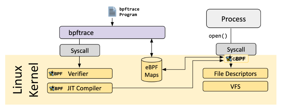 概述bpftrace是基于eBPF实现的动态的工具,使用DSL(Domain Specific Language)编写eBPF程序,使用LLVM编译eBPF字节码,BCC与LinuxBPF系统交互。直接使用DSL编写好的脚本(类似awk语言)可以执行,无需在内核中手动编译和加载。bpftrace在内核中实现动态追踪主要是使用Kprobe探针和Tracepoints探针。使用bpftrace可以更深入的进行操作系统上问题排查,如某个函数的调用次数和延时、追踪系统OOMKILL、TCP连接丢包等。都可以自定义脚本实现。 另外还有一个叫BCC的项目,跟bpftrace区别是BCC可以使用高级语言开发ebfp程序,如Java、Python、Lua……
