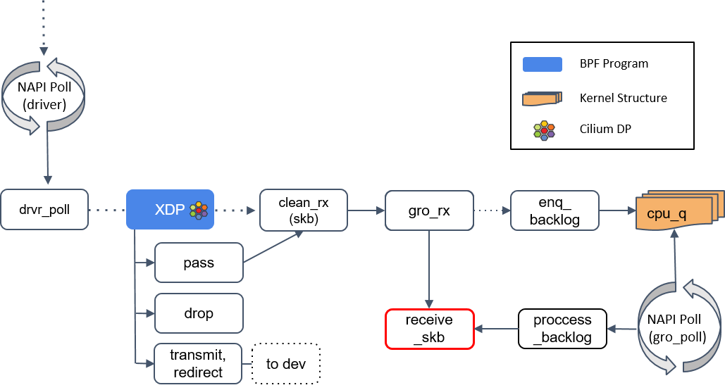 XDP(eXpress Data Path)是一个eBPF hook,可以在内核中执行eBPF程序实现对网络数据包处理,在Linux内核 4.8 版中引入。实现方式与Kernel bypass完全相反在sk_buffer之前数据包从driver出来以后就可以直接被XDP程序捕获执行,极大提升了网络数据包的处理效率。