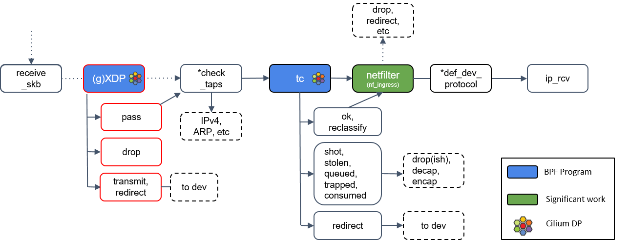 Generic模式的XDP:网卡和驱动不支持上述两种情况的XDP时,可以在receive_skb函数此点进行处理。这个处理的位置相对靠后,在tc处理点之前,这种性能最差,一般用于测试调试模式。
