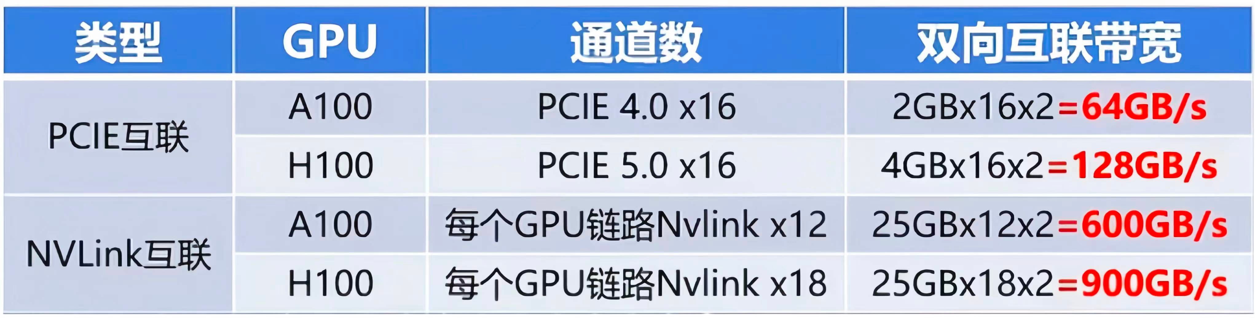 购买的单块GPU卡,直接插入服务器的PCIE插槽,GPU通过PCIE通道实现GPU和CPU互联,PCIE连接最大的问题是整体速率太低,不满足当前AI大模型的需求,当前最高的PCIE5.0和Nvlink4.0相比都会存在7倍的差异。