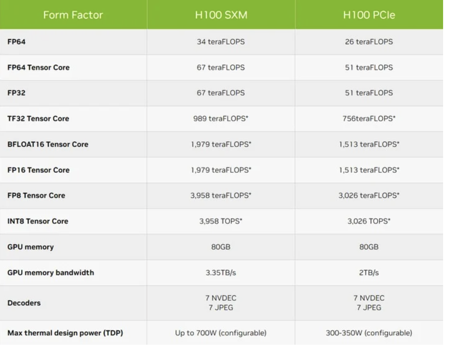 以H100为例,可以看到在不同类型GPU卡下的性能指标